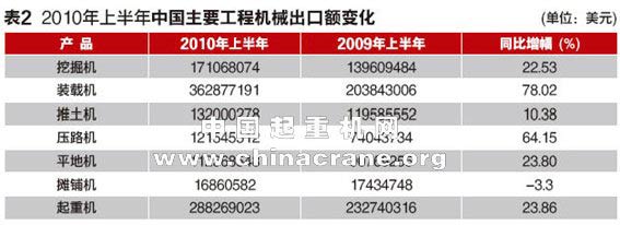 2010年上半年,壓路機(jī)、裝載機(jī)出口實(shí)現(xiàn)爆發(fā)式增長,出口量增幅分別高達(dá)95.97%、80.66%,出口額增幅則分別達(dá)到64.15%、78.02%。此外,挖掘機(jī)出口也呈現(xiàn)快速增長勢頭,出口量增幅為35.08%,出口額增幅為22.53%。