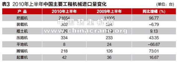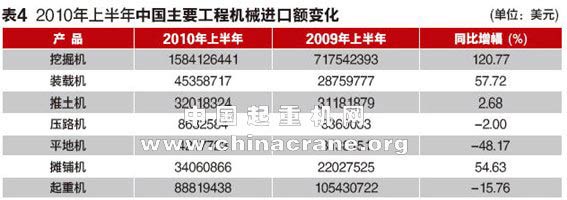 進(jìn)口額方面,2010年上半年平地機(jī)、起重機(jī)和壓路機(jī)出現(xiàn)了一定的收縮,下滑幅度分別為48.17%、15.76%和2.00%;挖掘機(jī)進(jìn)口額則呈現(xiàn)爆發(fā)性增長,達(dá)到15.8億美元,同比增長120.77%,位居增幅首位;另外值得注意的是,裝載機(jī)進(jìn)口量雖然出現(xiàn)6.79%的小幅下滑,進(jìn)口額卻出現(xiàn)了高達(dá)57.72%的高增長,位居增幅第二位;攤鋪機(jī)進(jìn)口額增幅位居第三位,為54.63%。見表4。