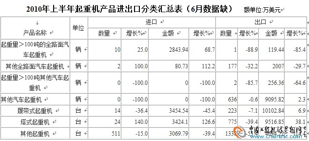 2010年上半年起重機產(chǎn)品進出口分類匯總表(6月數(shù)據(jù)缺) 額單位:萬美元
