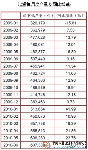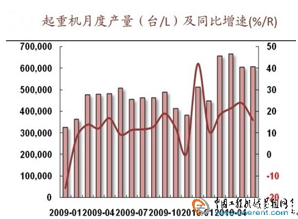 2010年4月份起重機產(chǎn)量為666513臺,同比增長21.36%;5月份起重機產(chǎn)量為606280臺,同比增長23.76%;6月份產(chǎn)量為607389臺,同比增長15.88%。至2010年6月,起重機市場已經(jīng)持續(xù)17個月同比正增長。2010年的2-5月,連續(xù)4月增幅逐步擴大;6月同比增速略有降低。
